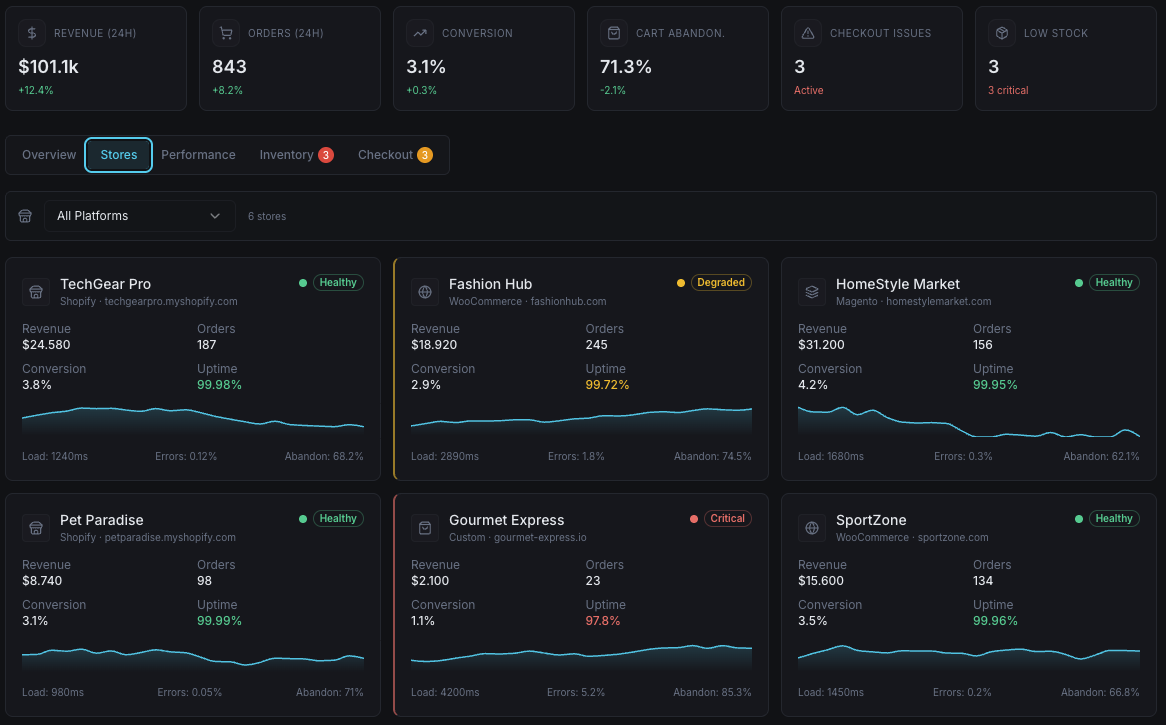 Protect your revenue with always-on monitoring for your online store, payment gateways, APIs, and checkout flows.