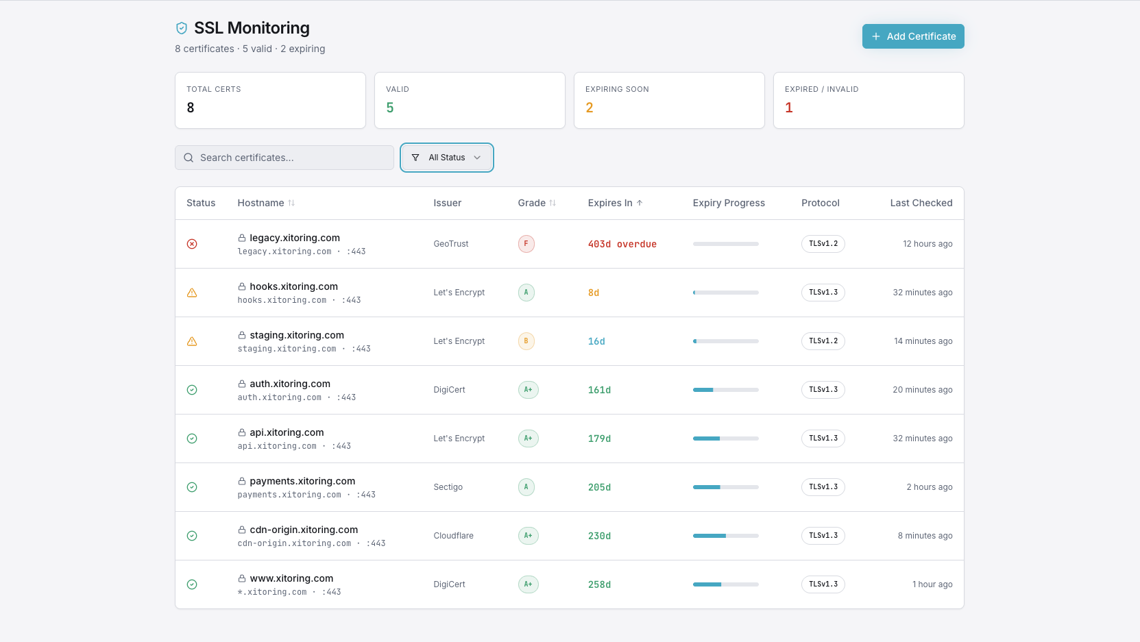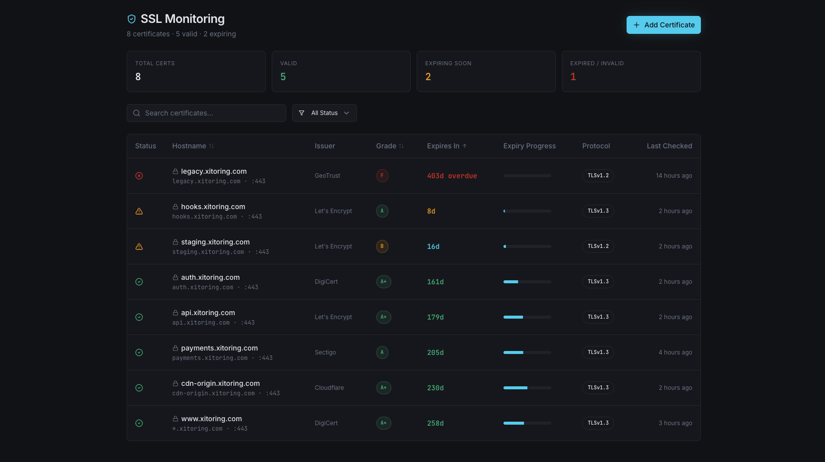 SSL Monitoring ensures your certificates never expire unnoticed. Xitoring validates chains, grades security configurations, and alerts your team before issues impact users.