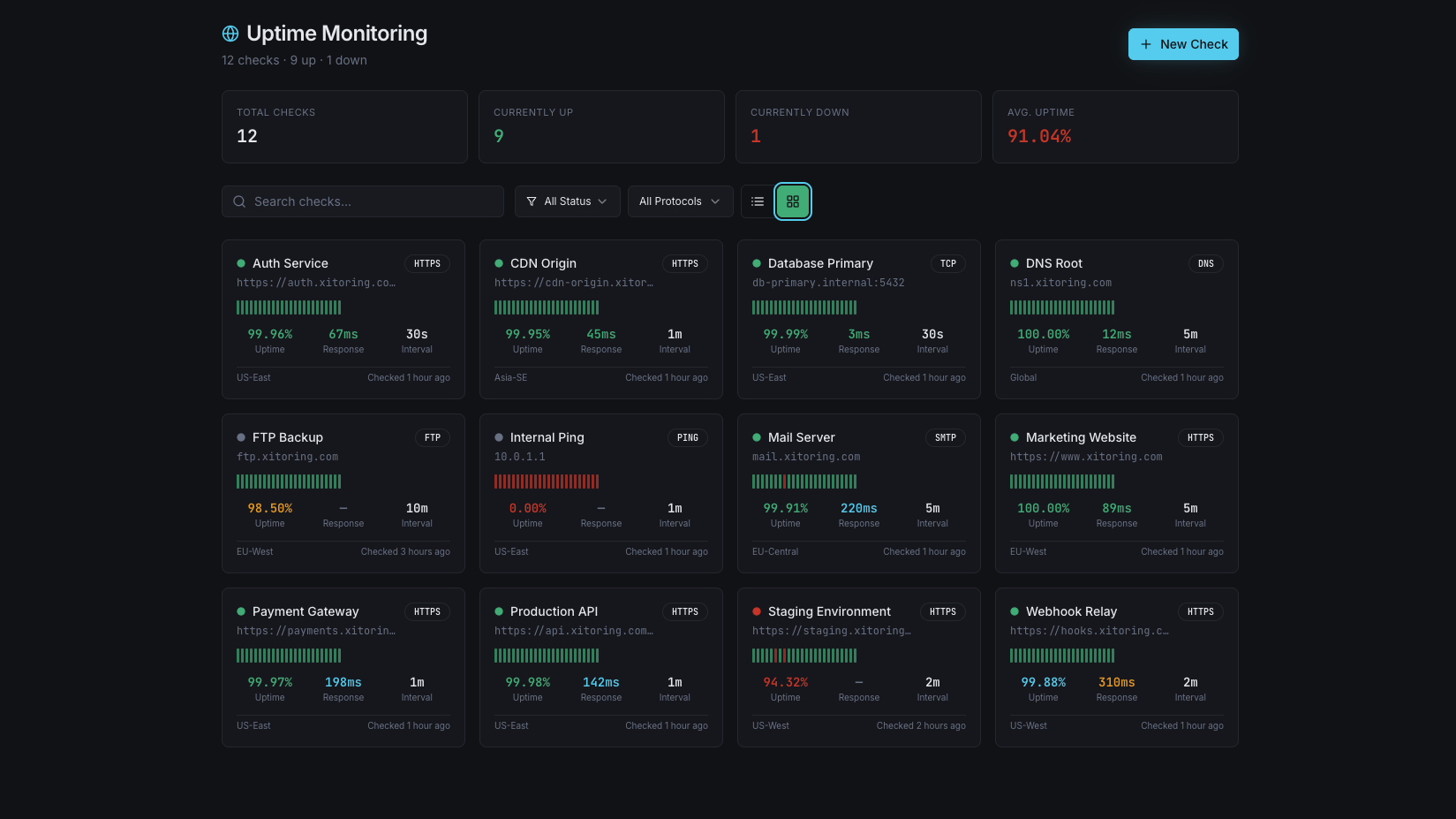 Enter your website or service URL and Xitoring starts monitoring from 15+ global nodes instantly. Choose your protocol, set your interval, and get alerted in seconds — no agent required.