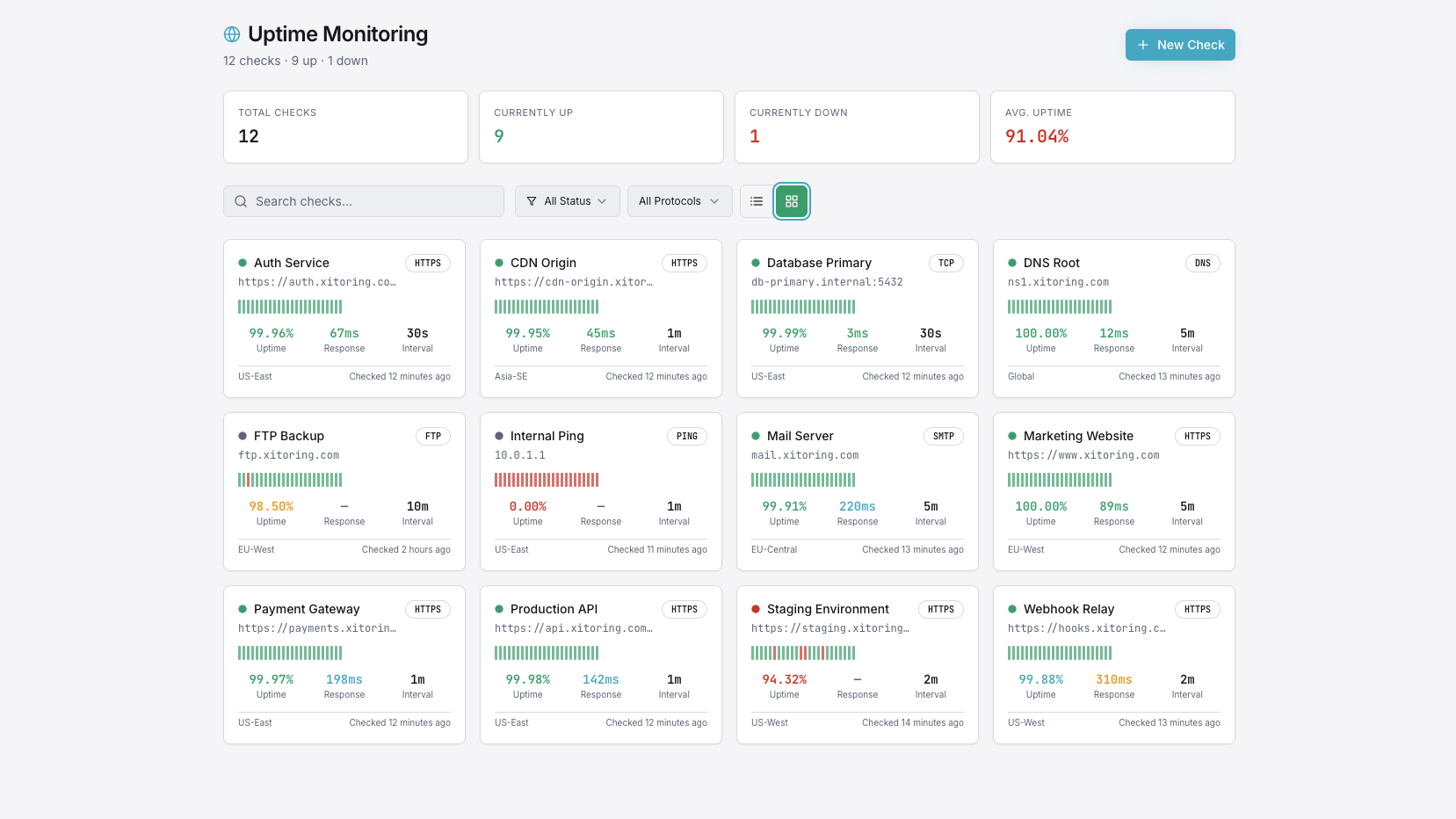 Xitoring's free plan includes 8 checks at no cost, you can easily create any type of check you desire within seconds. They're easily configurable, you can assign your desired notification roles to each check. There are too many features included within Uptime monitoring including different notifications, fault tolerance, repeated incidents, etc.