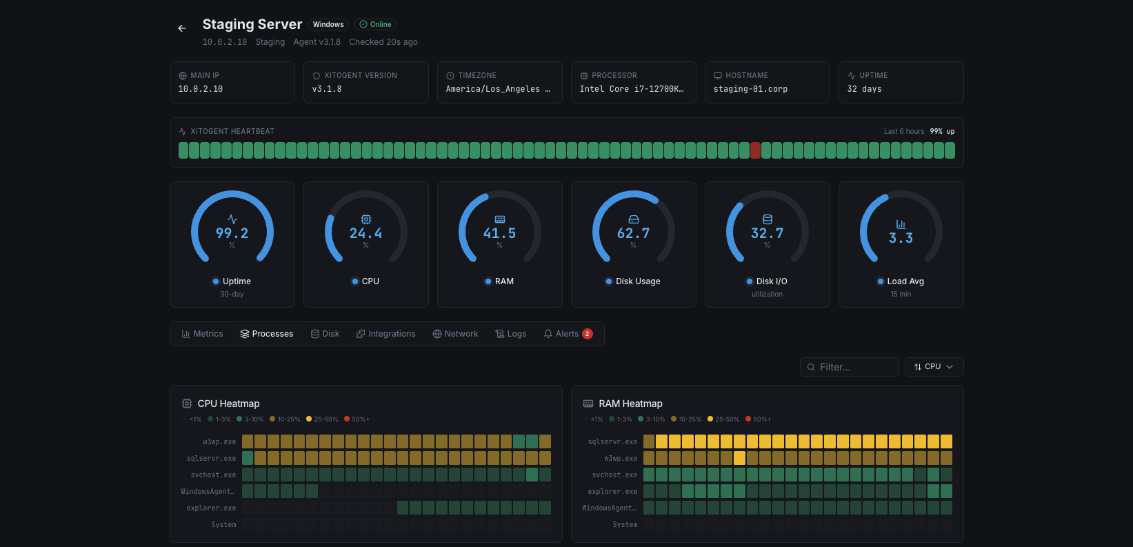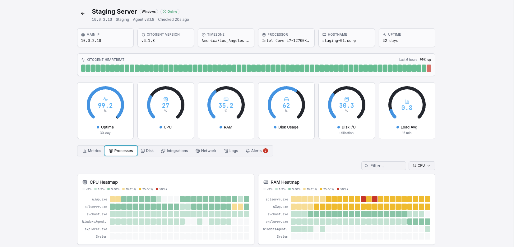Purpose-built for Windows Server environments. See performance counters, IIS application pool health, MSSQL query metrics, memory and page file gauges, and Windows services status — all in one unified view.